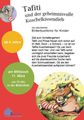 Auf der Suche nach Tafitis Kuschelkissen entdeckten die zuhörenden Kinder und Erwachsene so manchen tierischen Dieb, der sich mit dem Kissen davonschlich. Wir hatten eine vergnügliche Zeit miteinander und Tafiti hat zum Glück sein Kuschelkissen wiedergefunden. Bis zum nächsten Mal!
