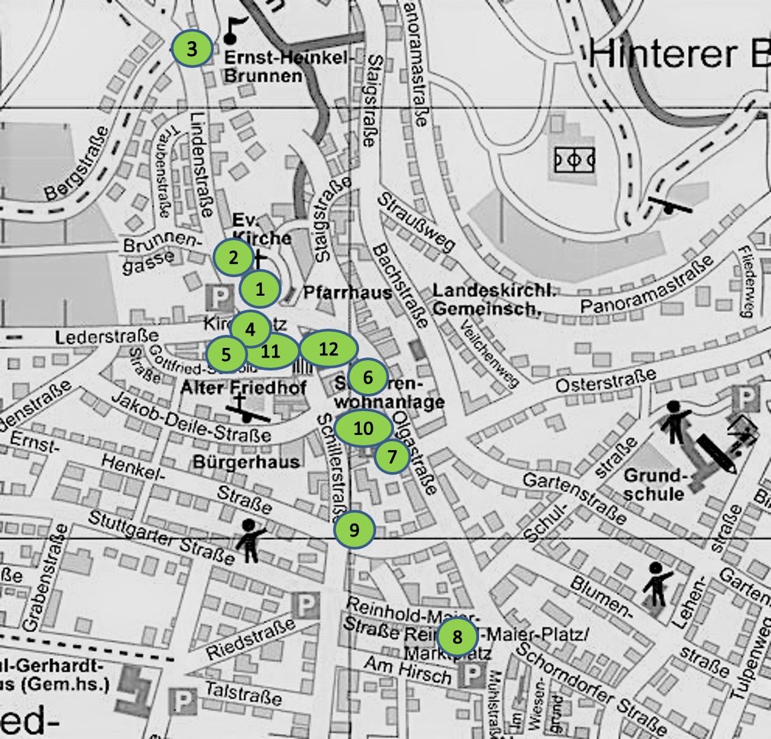 1 - Evangelische Pfarrkirche St. Dionysius; 2 - Altes Schul- und Rathaus; 3 - Ernst-Heinkel-Brunnen; 4 - ehemaliges Lehrerwohnhaus; 5 - Backhaus an der Linde; 6 - ehemaliges Olgastift; 7 - Gemeindebackhaus Olgastraße; 8 - Standort ehemaliges Geburtshaus Ernst Heinkel; 9 - Ernst-Heinkel-Straße; 10 - ehemalige "Untere Kelter"; 11 - ehemaliges Schulhaus; 12 - ehemalige "Mittlere Kelter" und "Obere Kelter" (Museum)