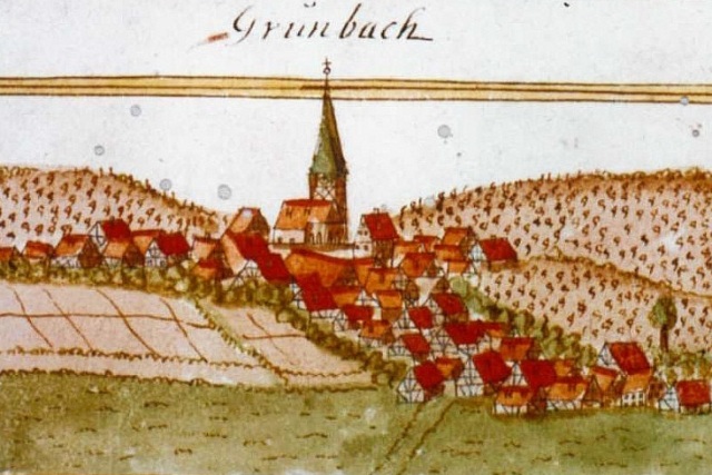 Im Jahr 1071 wird in einer Stiftungsurkunde für das neue Aureliusmünster des Klosters Hirsau als einer der 17 adeligen Zeugen ein Buobo de Gruonbach erwähnt. Auch in weiteren Dokumenten des 12. und 13. Jahrhunderts werden Angehörige dieser fränkischen Ministerialen aus dem niederrigen Adel erwähnt, die vermutlich am Hang oberhalb der Kirche ihren Wohnsitz hatten.