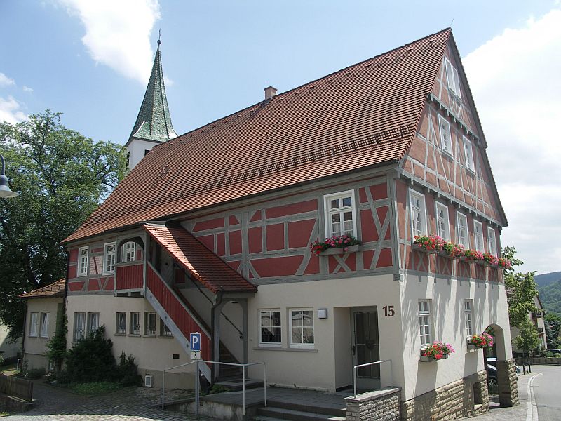 ist das Alte Schul und Rathaus, ein schmuckes Fachwerkhaus direkt oberhalb der Dionysiuskirche an der Lindenstraße (Ortsdurchfahrt) gelegen.