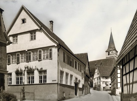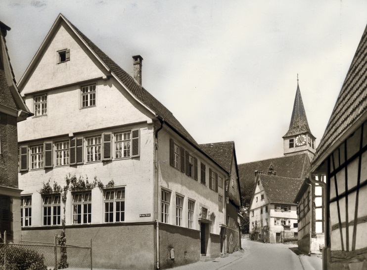 Auf der Miniatur der Kieserschen Forstkarten von 1686 ist westlich der Kirche ein großes Gebäude zu sehen. In der Großen Stuben fanden die Ratsversammlungen statt und sehr wahrscheinlich auch seit 1559 der Schulunterricht. Aus dem Jahr 1700 ist ein Beschwerdeschreiben an den Synodus, die oberste Kirchen- und Schulaufsicht in Stuttgart, erhalten. Darin beklagt sich der Schulmeister Dionysius Hegelin (1632-1707) über die zu kleinen Räumlichkeiten im Schul- und Rathaus. Zu dieser Zeit war der Heilige, also die Kirchenpflege, für den Unterhalt der Schule und der Schulmeisterwohnung im unteren Stockwerk verantwortlich.