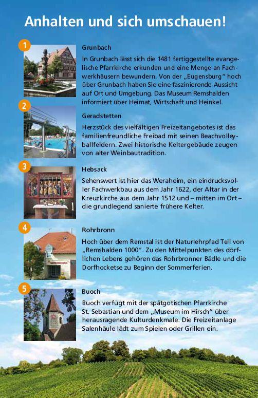 Die Abfahrt führt durch Weinberge nach Geradstetten, malerische Winkel durchstreifen Sie in der Klause, vorbei an der Konradskirche und Kelter. Erholen Sie sich auf dem Flachstück nach Hebsack und tanken Sie Kraft für den letzten ordentlichen Anstieg über die Weinsteige nach Rohrbronn und von dort – entlang dem Naturlehrpfad – über eine Schleife weiter nach Buoch. Belohnt werden Sie dort von einem Bilderbuch-Panorama und die für alle Mühe belohnende Schluss-Abfahrt durch Wald und Weinberge nach Grunbach.