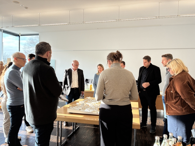 Bei einem Pressegespräch wurden die Modelle der Wettbewerbssieger dann der Öffentlichkeit präsentiert: Der 1. Preis für die Baufelder 1 und 2 geht an die Büros a+r Architekten und g2 Landschaftsarchitekten aus Stuttgart, gemeinsam mit BPD Immobilienentwicklung als Investor des Projekts, ebenfalls aus Stuttgart. Der Vorsitzende des Preisgerichts, Dr. Eckart Rosenberger gab die Gründe für die Prämierung bekannt. Besonders wichtig bei der Entscheidungsfindung war die Einfügung und der Übergang zur bestehenden Wohnbebauung. Gemeinsam mit der Gestaltung des Quartiershauses in der Mitte wurde diese Aufgabe hervorragend gelöst. Durch die Bebauung werde eine hohe Identität gestiftet. Die Häuser seien zwar von außen erschlossen, sämtliche Treppenhäuser zeigen aber in Richtung des Quartiersplatzes, welcher sich in der Mitte des Quartiers befindet. Architektonisch zeichnet sich die Arbeit dadurch aus, dass das Quartiershaus in der Mitte den höchsten Punkt darstellt und die Bebauungen zum Rand hin flacher werden. So hat man von allen Wohnungen aus einen schönen Blick ins Weite. Zudem sieht das Modell ein Co2-freies Quartier vor mit einem eigenen Nahwärmekonzept. Dr. Rosenberger erklärt, dass das Preisgericht insgesamt sehr glücklich mit dem 1. Preis sei.